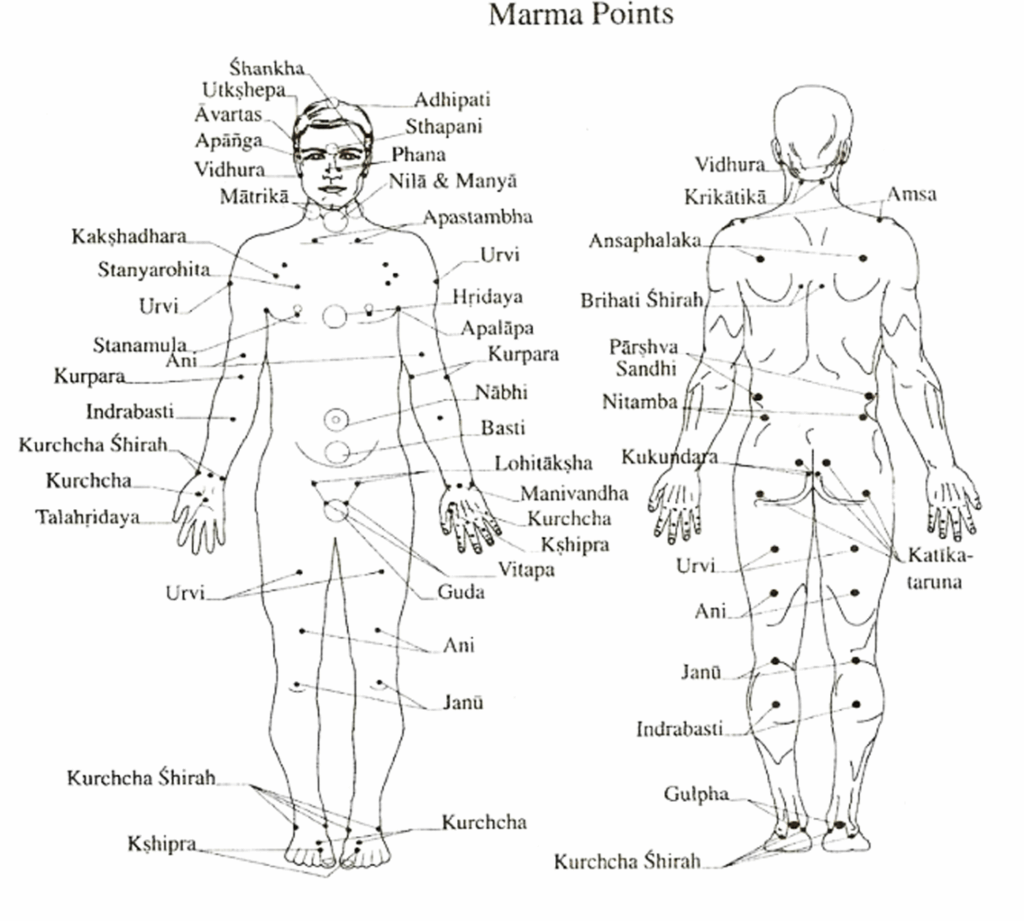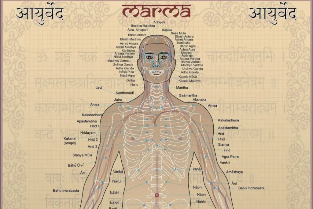 Krishnamacharya drew deeply from Ayurveda and Marma Vijñāna. Marma points are vital energy centers where muscles, vessels, ligaments, bones, and nerves intersect. When an injury occurs near a marma point, the healing process slows if energy remains blocked.